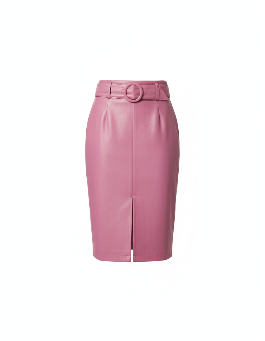 Cette jupe crayon est de couleur rose et présente un aspect cuir. Elle est dotée d'une ceinture assortie à boucle ronde et d'une fente à l'avant.