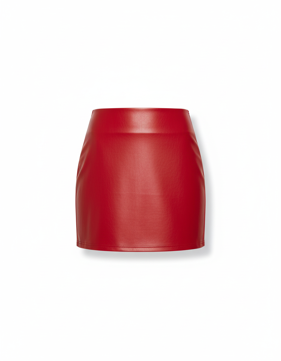 Cette jupe crayon est une pièce courte et ajustée, caractérisée par sa couleur unie rouge et son aspect brillant. Elle présente une taille haute et une coupe mini.