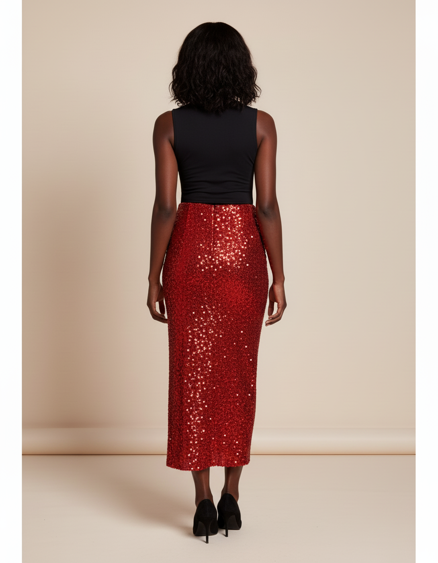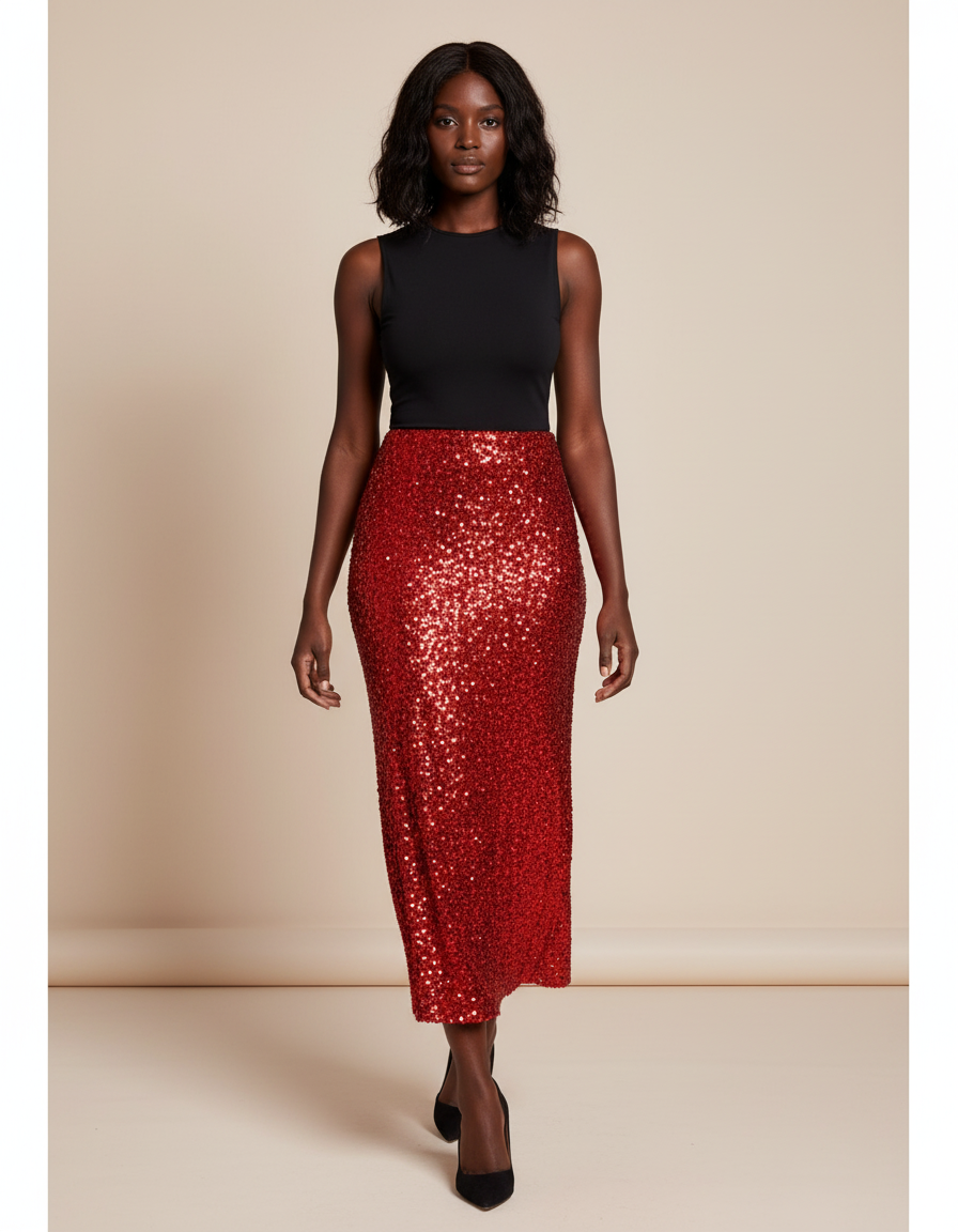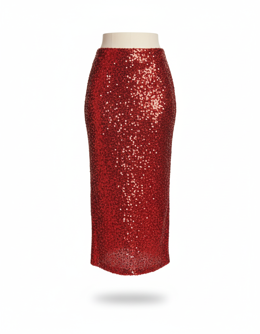 Éblouissez avec notre Jupe Crayon Rouge Paillettes Chic, parfaite pour toutes vos occasions spéciales.