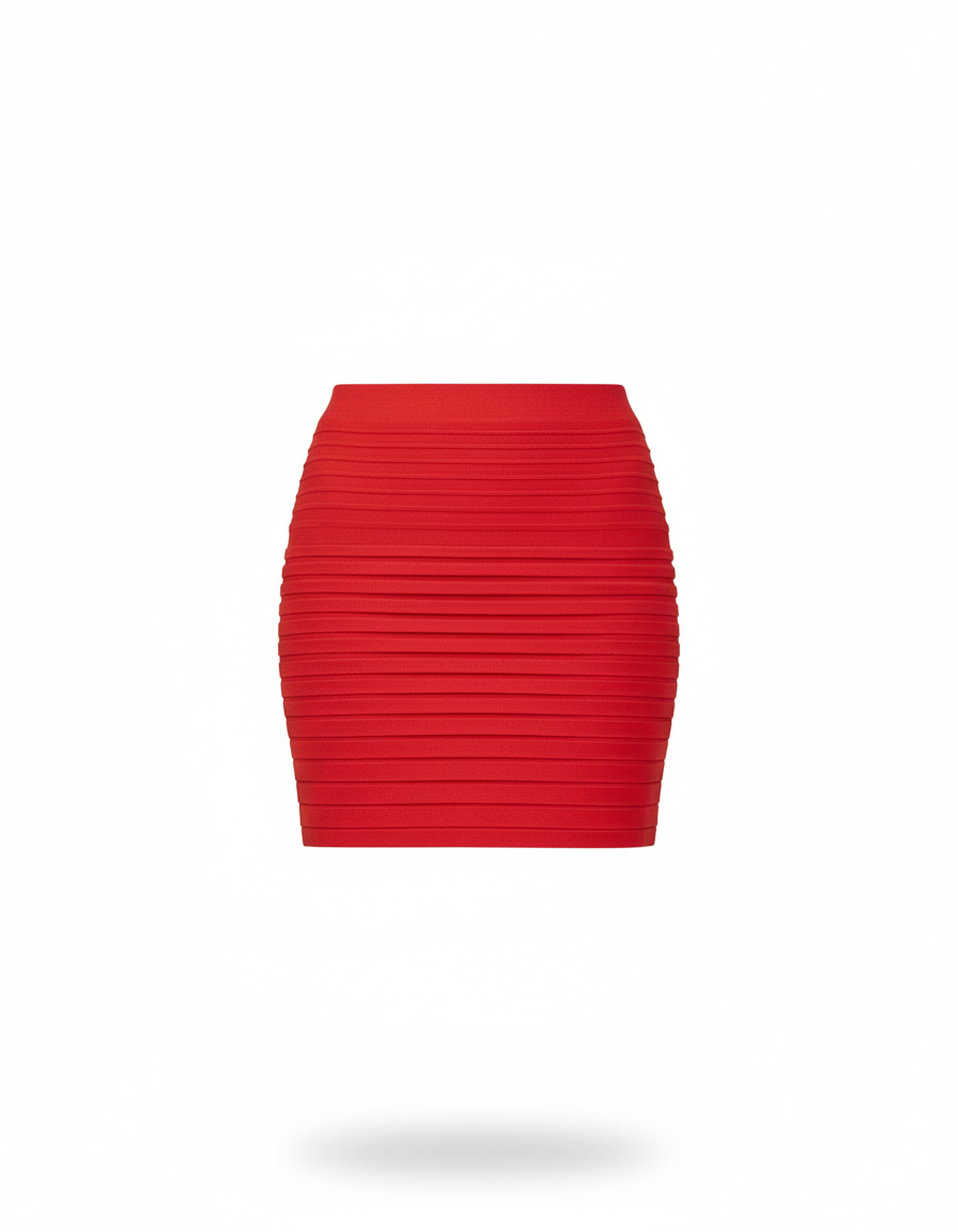 Cette jupe crayon de style mini est de couleur rouge. Elle présente une texture plissée horizontale sur toute sa surface.