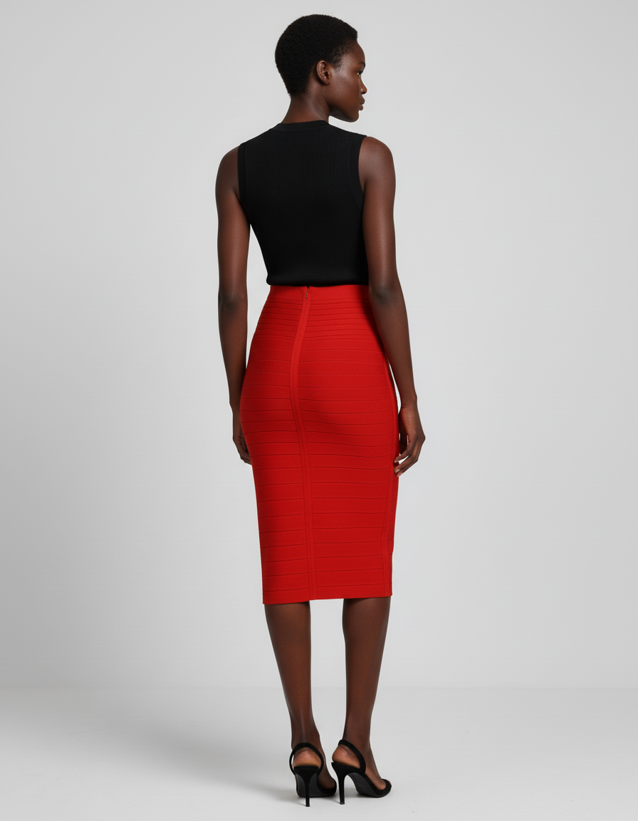 Cette jupe crayon rouge élégante allie un style classique à une touche moderne.