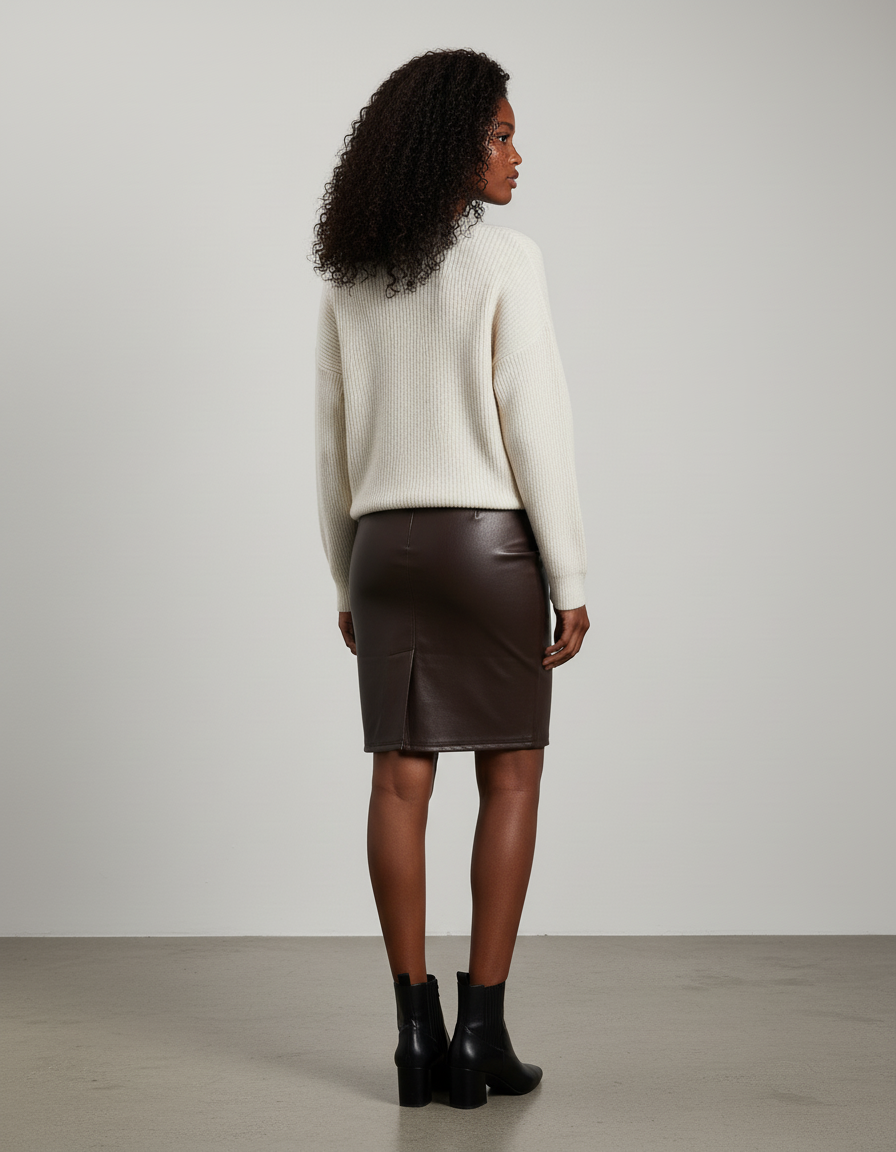 Son simili cuir premium, d'un marron profond et riche, offre le luxe visuel et le toucher d'un cuir véritable, tout en garantissant un confort optimal et une facilité d'entretien appréciable. La coupe crayon, parfaitement ajustée, met en valeur vos courbes avec distinction, tandis que sa matière souple assure une liberté de mouvement tout au long de la journée. C'est la jupe qui se démarque par son mariage parfait entre l'esthétique audacieuse du cuir et l'engagement éthique, pour un style intemporel et assumé.
