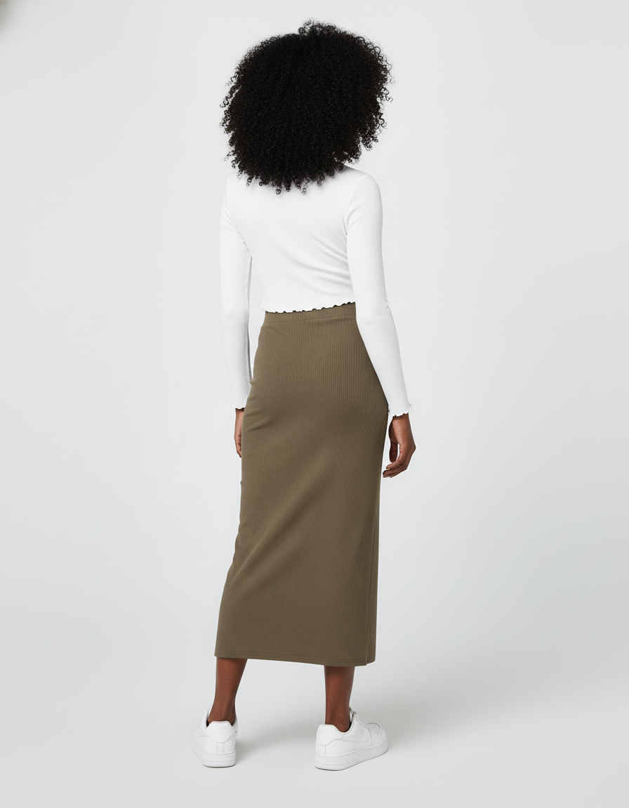 Cette Jupe Crayon Sportswear présente une coupe ajustée et une longueur midi. Elle est confectionnée dans un tissu côtelé de couleur vert kaki et possède une fente latérale.