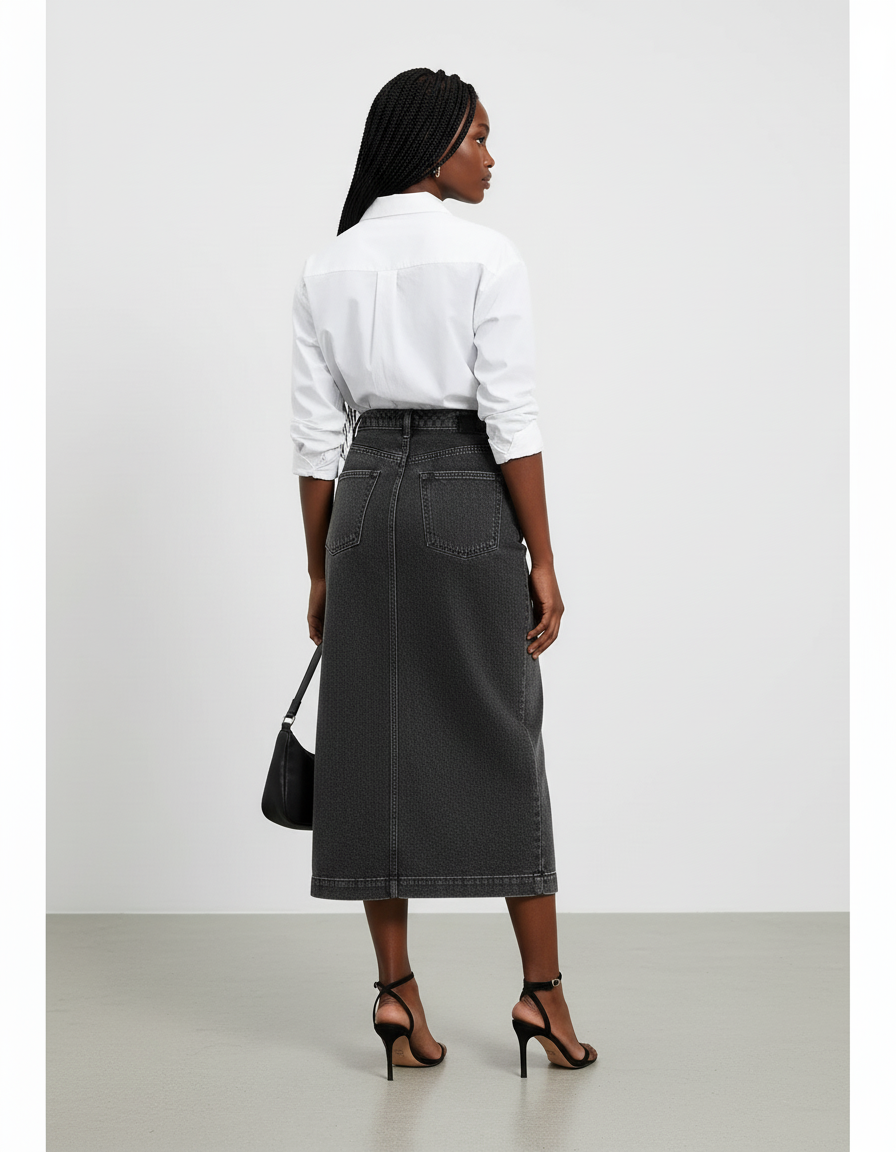 Découvrez notre Jupe Crayon Taille Haute en Jean, une pièce maîtresse conçue pour la femme moderne qui ne transige ni sur le style ni sur le confort. Son denim gris de qualité supérieure offre un tombé impeccable, épousant subtilement la silhouette sans jamais entraver vos mouvements. Grâce à sa coupe étudiée et sa matière légèrement stretch, elle garantit une liberté totale, vous permettant de passer de réunion en réunion avec aisance, tout en conservant une allure sophistiquée et professionnelle. C'est la promesse d'une élégance sans effort, du matin au soir.