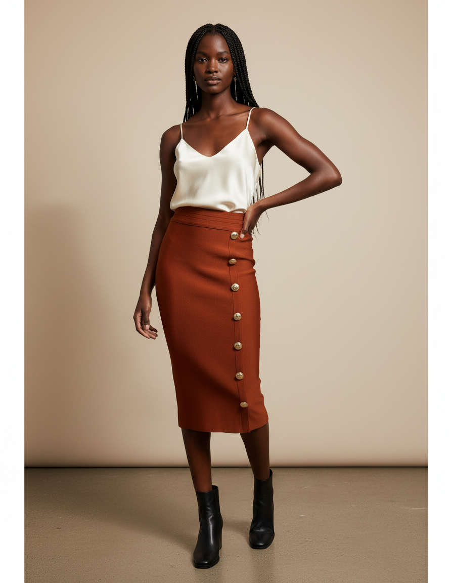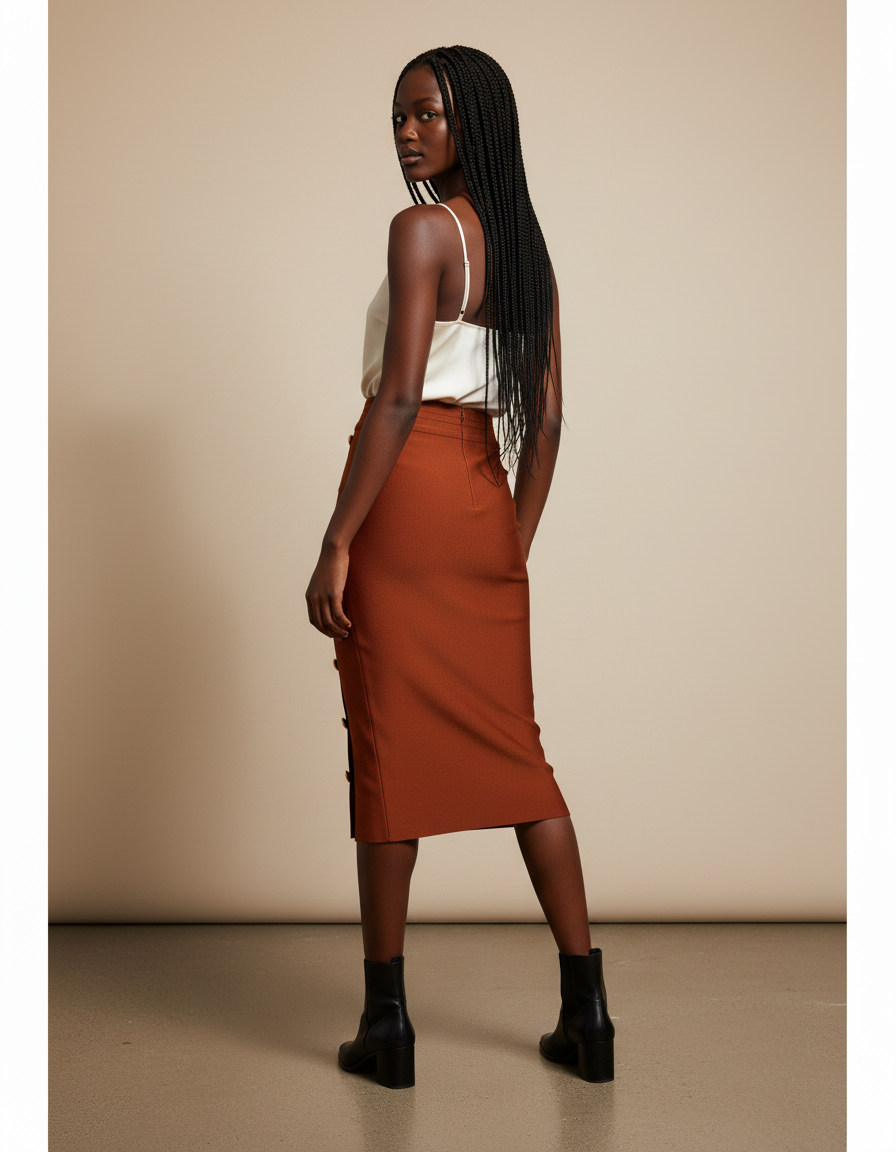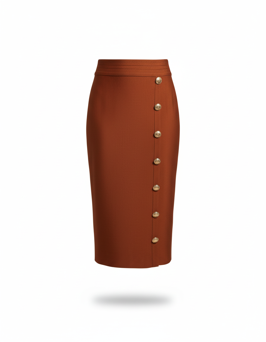 Une jupe crayon de couleur terracotta, caractérisée par une rangée de boutons dorés le long d'un côté. Sa coupe est ajustée et sa longueur atteint le dessous du genou.