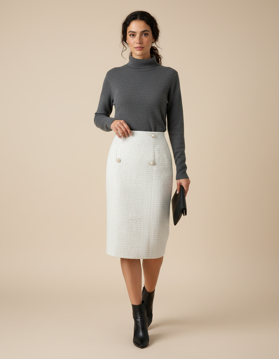 Associez notre Jupe Crayon Tweed Boutons Élégante à un pull col roulé ajusté anthracite pour une silhouette professionnelle impeccable, idéale pour le bureau. Pour des journées de travail exigeantes ou une réunion importante, un chemisier en soie et un blazer structuré complèteront harmonieusement votre look, affirmant votre présence avec subtilité. Cette pièce polyvalente s'adapte également à vos moments après-bureau : troquez le blazer pour un top délicat et des bijoux discrets pour une transition élégante vers un dîner ou un événement professionnel plus décontracté.