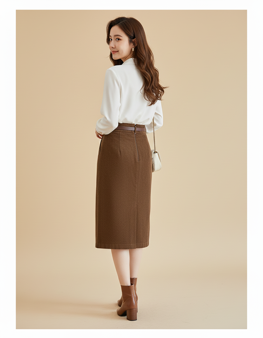 Pour le bureau, associez-la à une blouse en soie crème et des escarpins pour une allure professionnelle irréprochable. En soirée, transformez-la avec un chemisier ajusté et des bottines élégantes, agrémentée d'une ceinture fine pour souligner la taille, comme sur notre modèle. Sa teinte marron riche et sa texture velours côtelé apportent une profondeur et un caractère distinctifs, faisant de cette jupe une pièce incroyablement polyvalente, facile à intégrer dans une multitude de looks, toujours avec une touche d'élégance intemporelle.