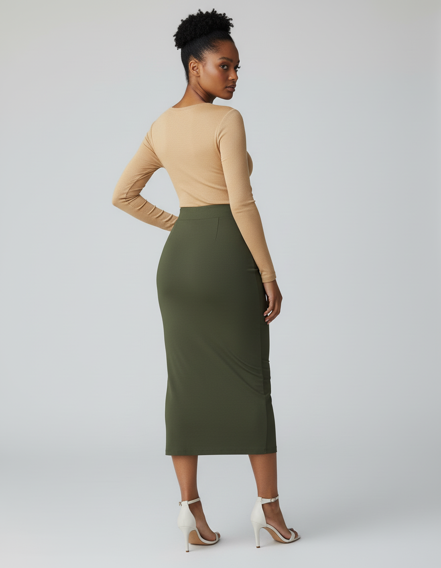 Élégance et polyvalence se rencontrent avec notre jupe crayon vert bouteille, parfaite pour toutes les occasions.