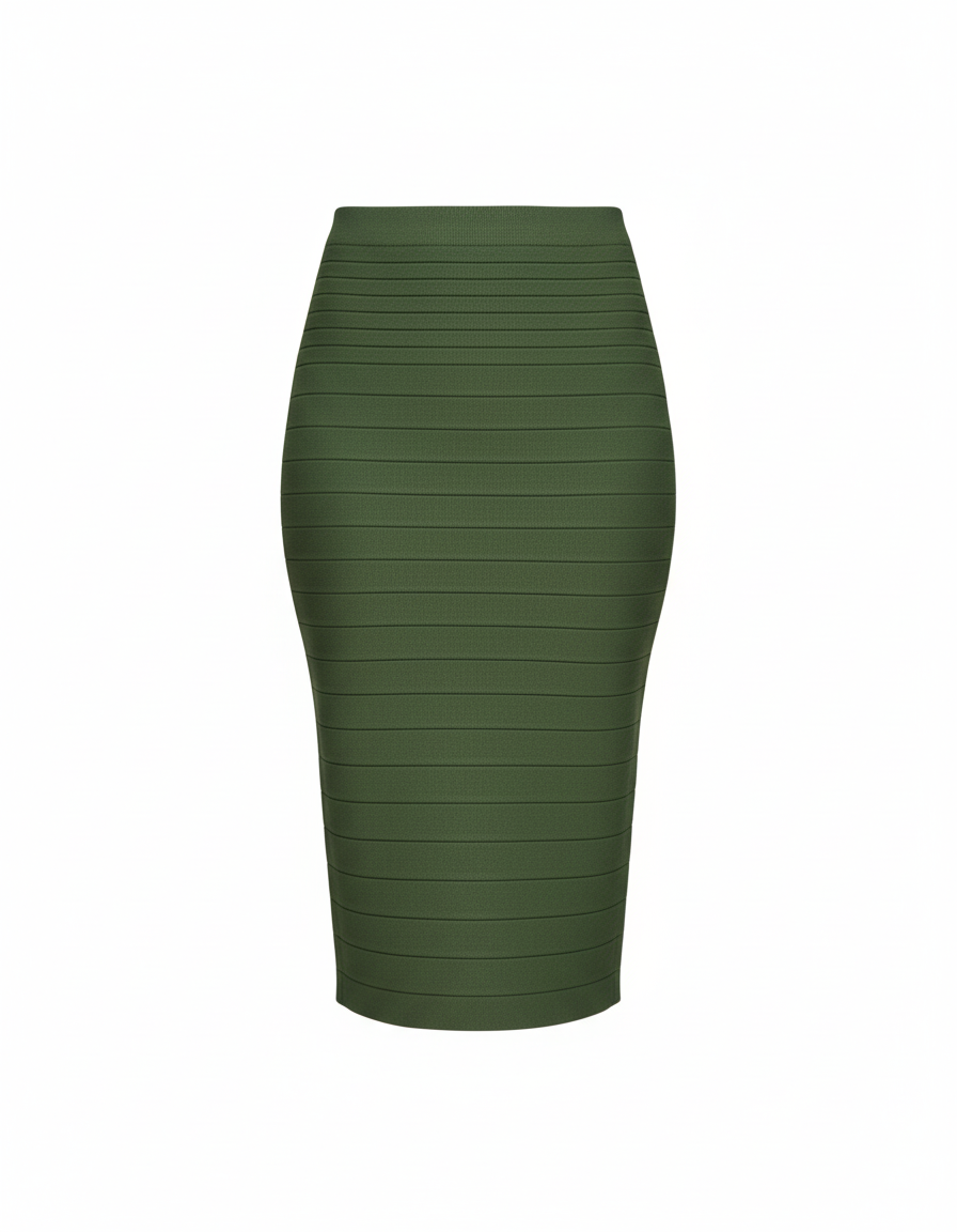Cette jupe crayon présente une couleur verte et une texture à bandes horizontales. Sa coupe est ajustée et sa longueur atteint le genou.