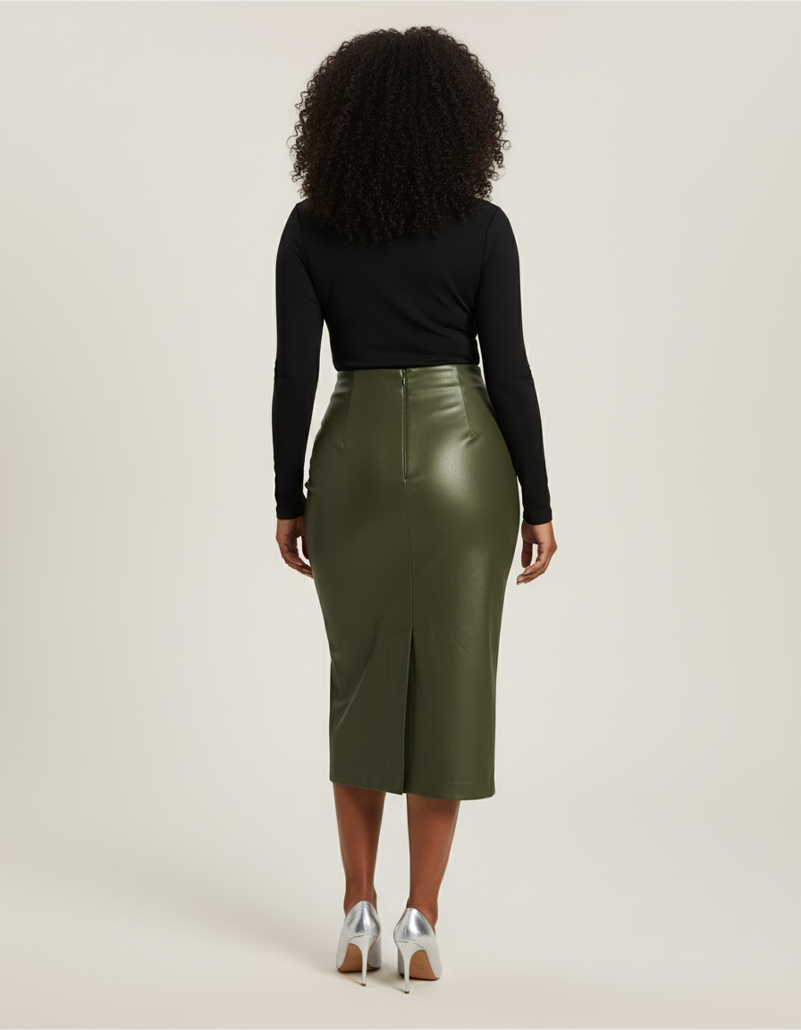Ce qui distingue cette pièce unique, c'est son similicuir de haute qualité, offrant la texture luxueuse et l'éclat subtil du cuir véritable, sans compromis sur l'éthique ou le confort. Sa coupe crayon impeccable épouse vos courbes pour une silhouette élégante et allongée, tandis que sa couleur verte polyvalente se prête à une multitude d'associations, du blazer structuré aux mailles douces. Facile à entretenir et conçue pour durer, elle incarne un luxe accessible et conscient, faisant d'elle l'investissement parfait pour une garde-robe contemporaine et impactante.