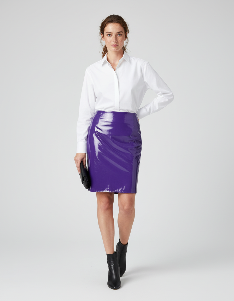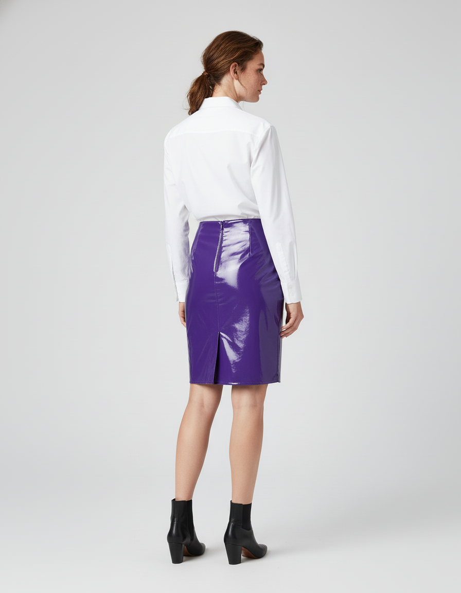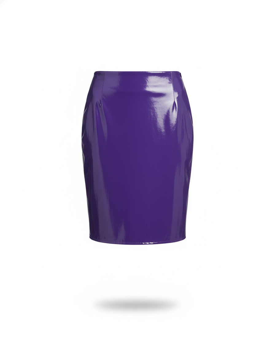 Osez l'Éclat : La Jupe Crayon Violet Verni, Pièce Maîtresse de Votre Garde-Robe