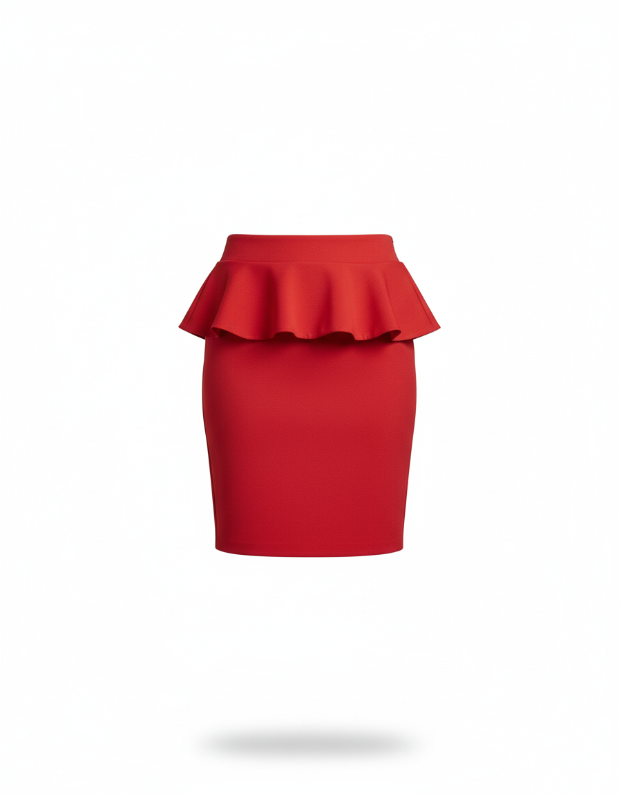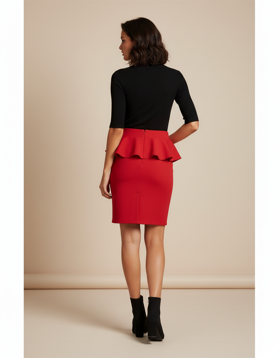 - Coupe : Jupe crayon ajustée avec un volant (peplum) à la taille.