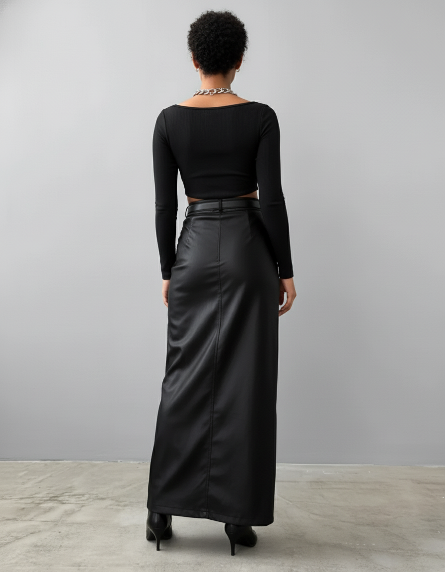 Adoptez un look audacieux et sophistiqué avec notre jupe longue crayon en similicuir.