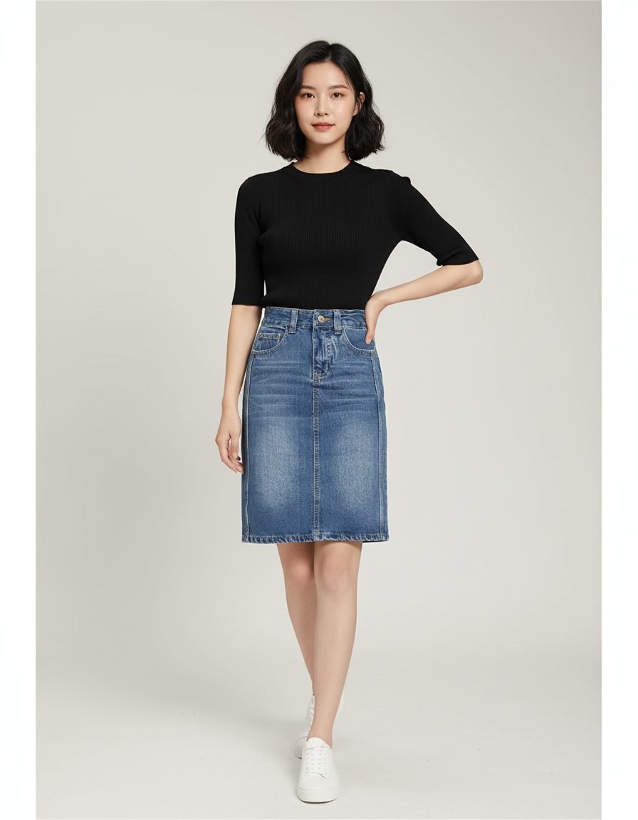 Sa polyvalence en fait un allié précieux. Pour un look "Quotidien" parfait, associez-la à un t-shirt blanc et des baskets pour une touche "Décontractée" et tendance, comme sur l'image. En soirée, transformez-la avec un chemisier en soie et des talons pour une élégance inattendue. Pour le bureau, un blazer structuré et des mocassins lui confèrent une dimension professionnelle. La "Jupe Jean Crayon" est plus qu'une jupe, c'est une invitation à composer une multitude de styles avec aisance et sophistication.